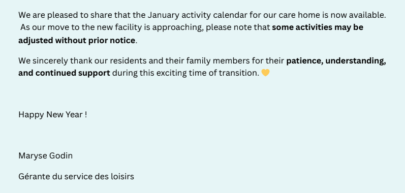 Villa Providence Shediac Inc. Villa Providence Shediac Inc. is a nursing home for people requiring long-term care. The home is non-profit and governed by a Board of Directors. Villa Providence Shediac Inc. was founded in 1970 and now has 174 residents. Since its opening, Villa Providence Shediac Inc. continues to meet the needs of its residents and the community. FAMILY INFO LIVING IN OUR HOME Activity program Activity photos