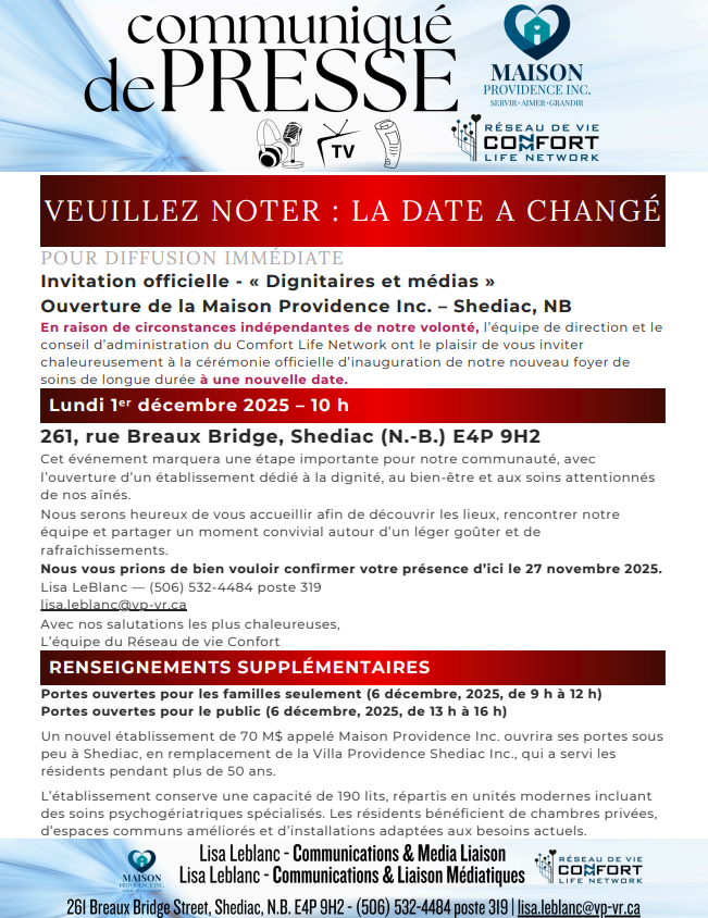 Invitation officielle - Ouverture de la Maison Providence Inc. - Shediac, NB